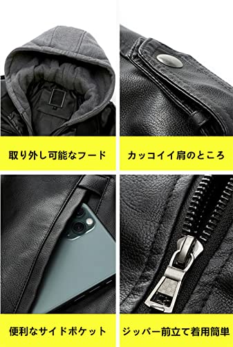 - ライダースジャケット メンズ PU フェイクレザー ジャケット 取り外し可能 フード付き コート 大きいサイズ M-3XL